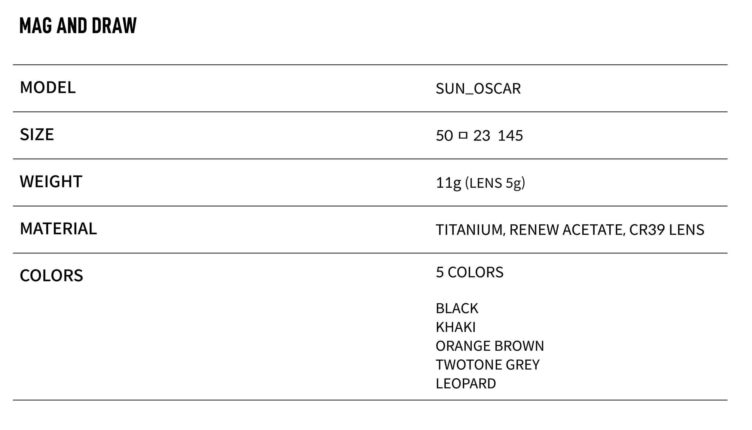 웨이페어 스퀘어쉐입의 EASTMAN社 리뉴아세테이트 소재로 제작된 OSCAR_SUN 입니다. 셀룰로이드 소재로 고광택, 고분사 소재로 고급스러운 색감과 가볍고 강한 내구성을 자랑합니다.