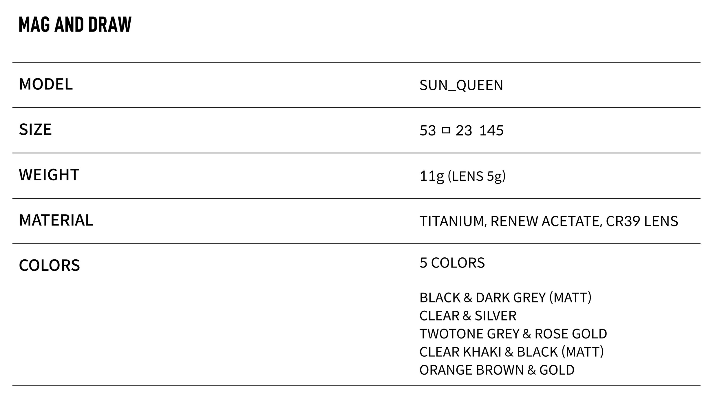 매그앤드로우의 2024년 컬렉션을 통해 선보이는 퀸(QUEEN) 선글라스를 소개합니다. 오버사이즈 라운드쉐입 디자인과 리뉴아세테이트, 베타티타늄 소재로 가벼운 착용감을 선사합니다.